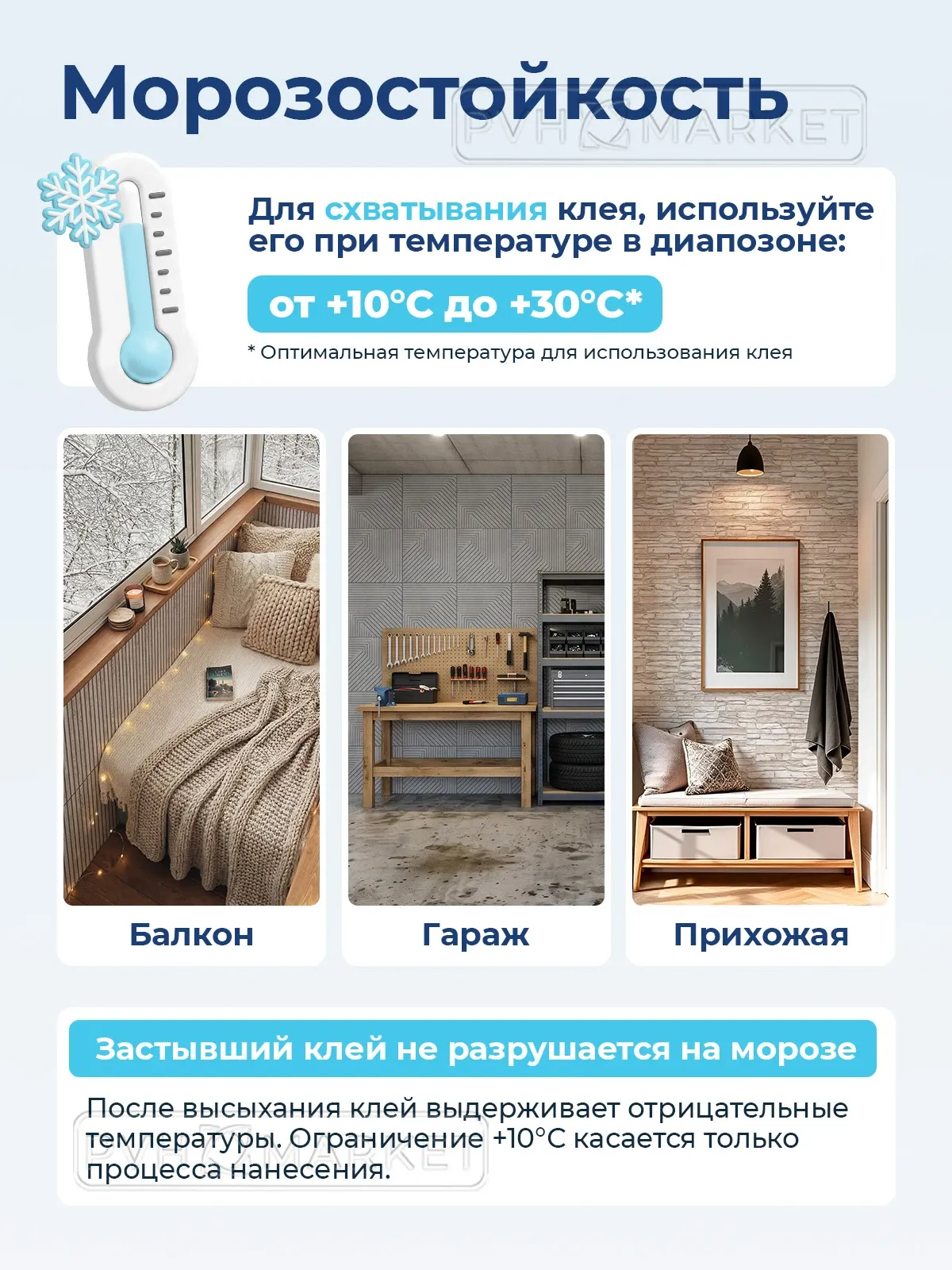 Этот универсальный клей для панелей ПВХ обеспечивает сильное сцепление, устойчив к влаге и перепадам температур, что делает его идеальным для использования в ванной комнате, на кухне и в других помещениях с повышенной влажностью.