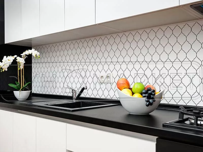 Дизайнерский прием словно четкий пазл складывается в чудесную единую картину. Бело-серебристая цветовая гамма, плавные переплетения, четкость границ и благородный контраст — это то, что позволит вашему пространству заиграть по-новому. Несомненно, стильный узор Арабеска в серебристом решении - отличный выбор для Вашей кухни.