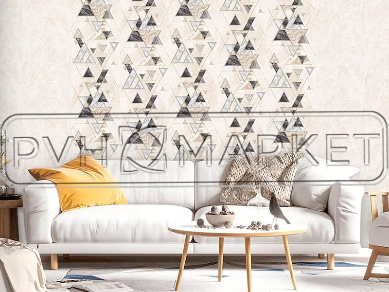 Роскошные пластиковые панели для стен выполнены в изысканных бежевых тонах. На светлом фоне причудливо переплетаются геометрические фигуры разных размеров. Сочетание природных оттенков коричневого и серого визуально выравнивают поверхность стен.