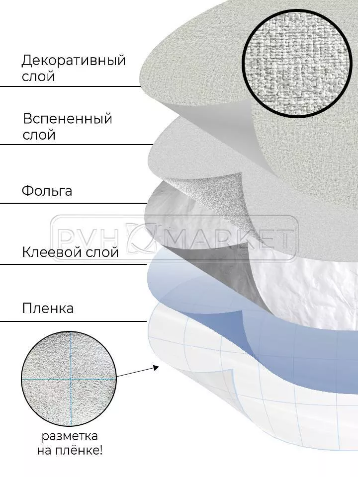 - Самоклеящиеся обои имеют слои (вспененный и фольгированный), которые обеспечивают эффекты тепло- и звукоизоляции.