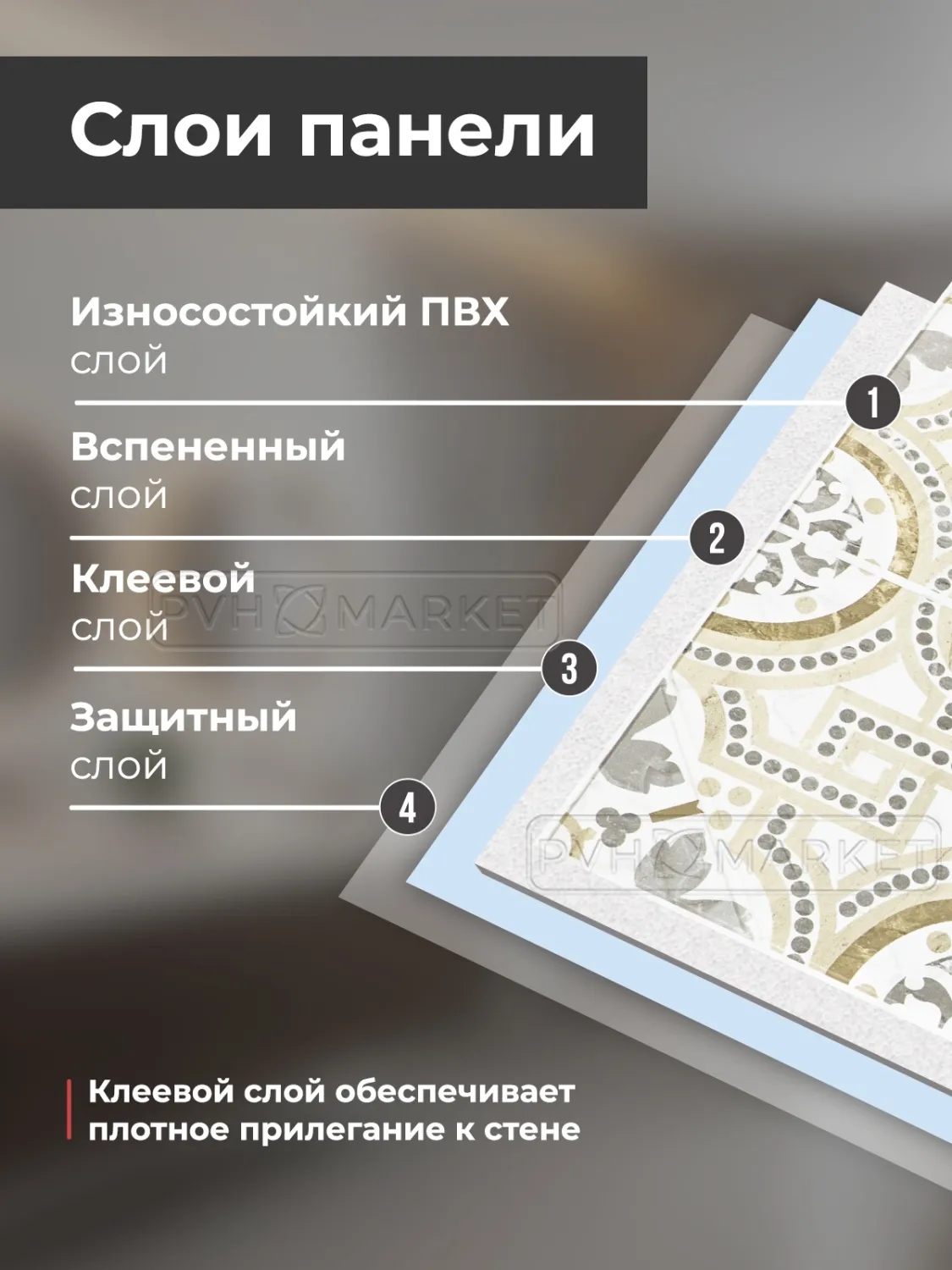 Cовременное решение для быстрого и стильного обновления интерьера без сложного ремонта. Панель легко крепится на любую ровную поверхность: стены кухни, ванной, прихожей или балкона. Благодаря прочной основе и качественному клеевому слою она надежно фиксируется и устойчива к влаге, перепадам температур и загрязнениям.